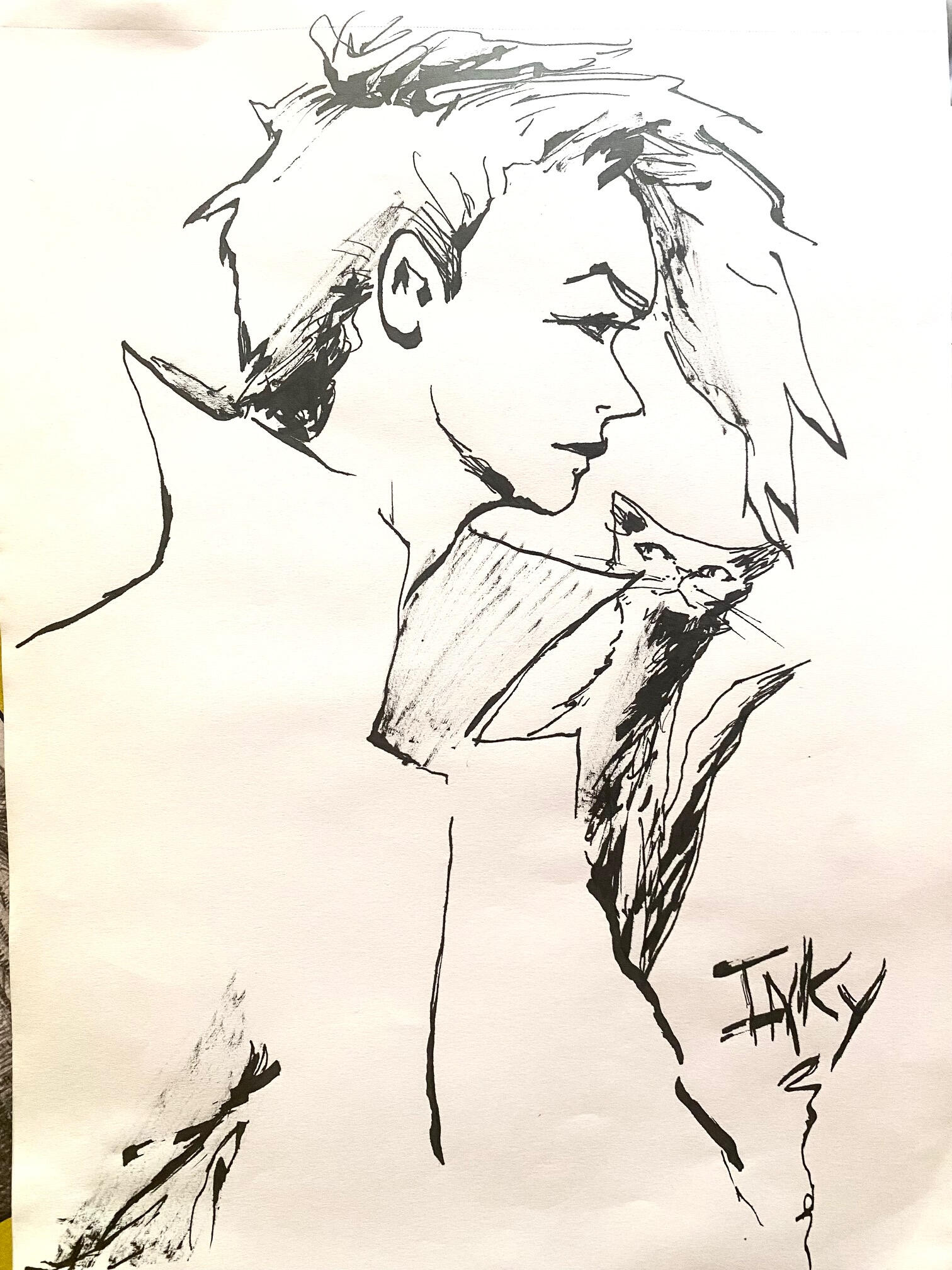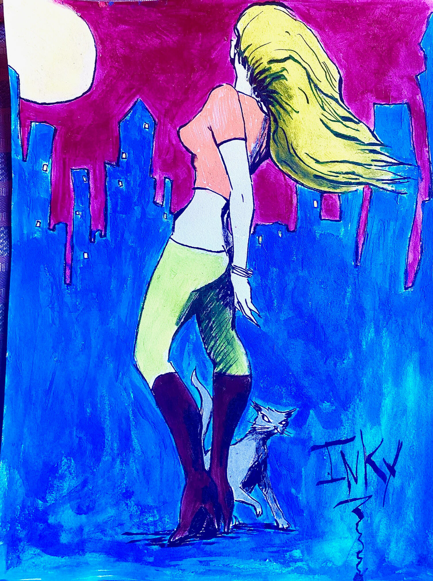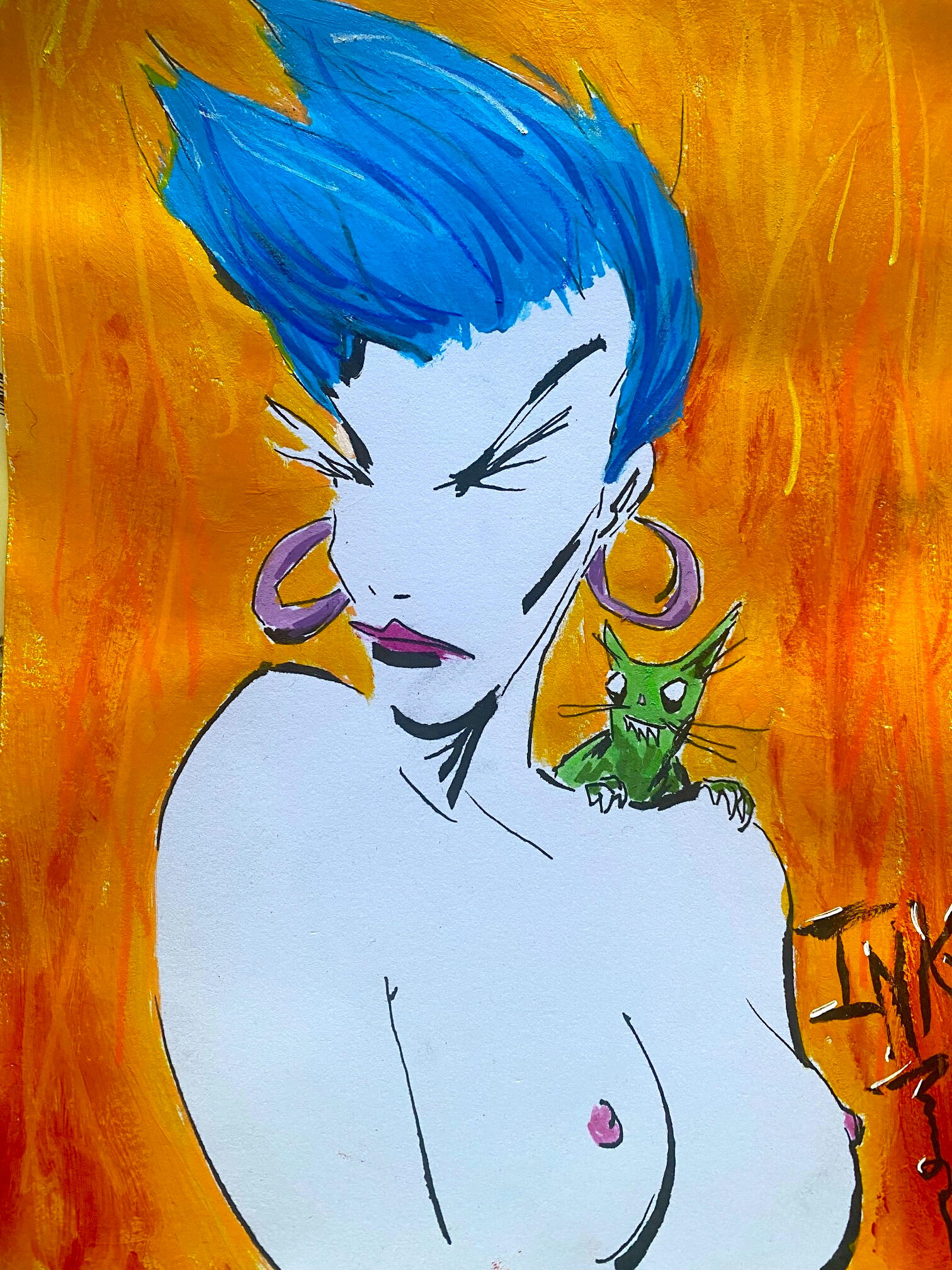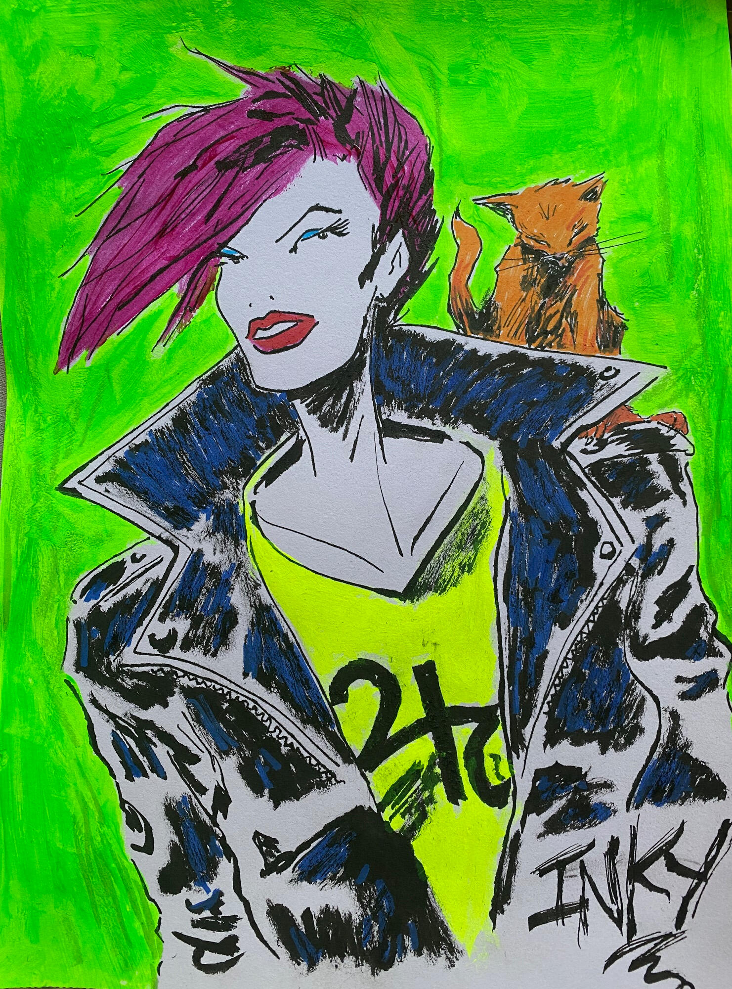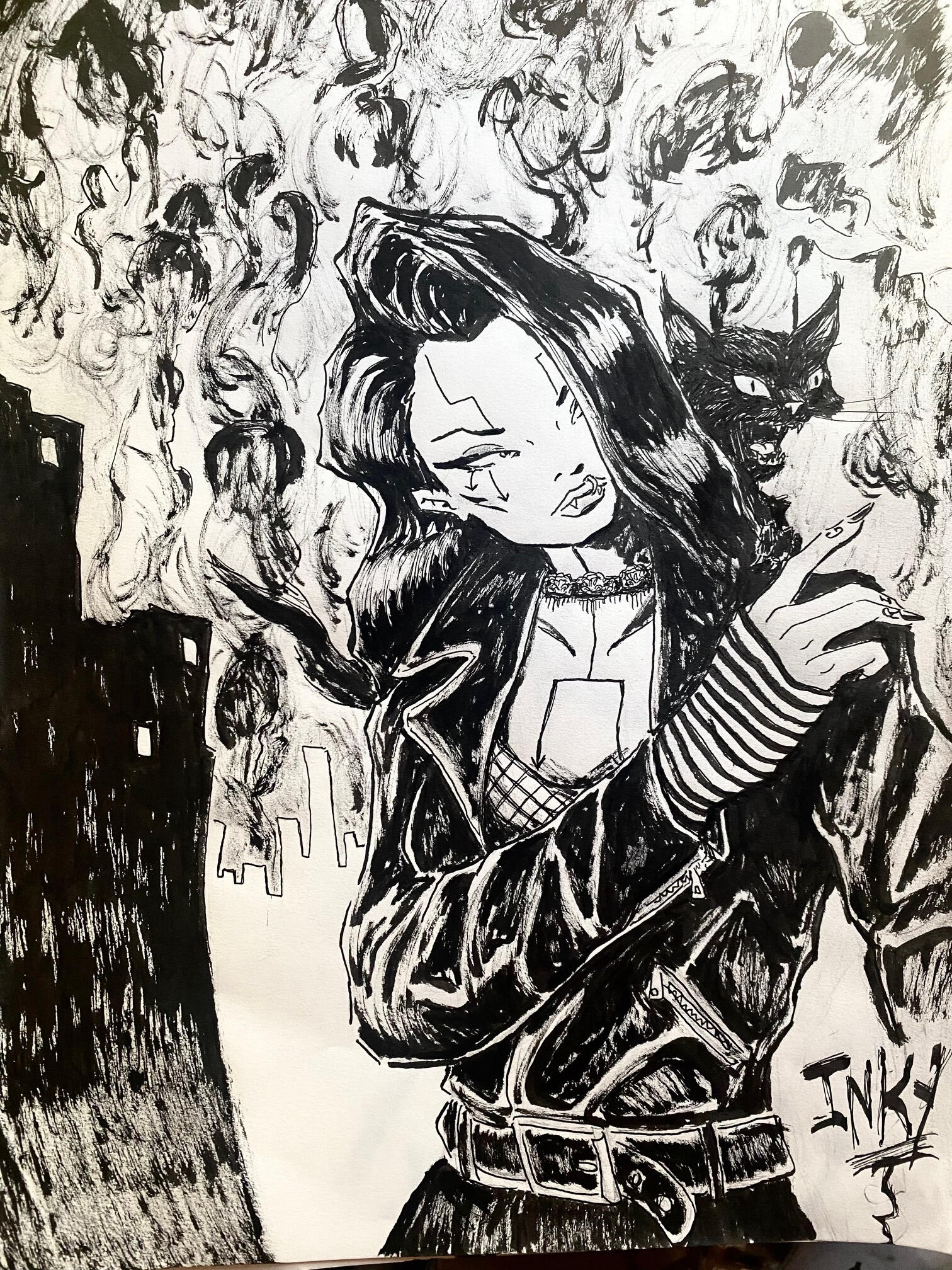 So yeah, I’m Inky:) I live up in the woods with my buddies and I am roughly half a hundred years old. And yeah, perhaps you have heard I am autisticAF (DXd, etc. I was on an episode of Risk!, talking about it!). That much is totally true! I also love animals too much to grind chunks of their deceased bodies up with my teeth in my slimy mouthhole and swallow said chunks down into my guts and you know the rest. I am totally fine if you do that though! Just don't eat my kitty:( I also love comics and I have been hired to illustrate some and I want to make MORE. I have a massive comic project of my own in the works:) I also love comics too much to grind chunks of their deceased etc. and you know the rest.So I scribble (draw and paint), make noise (drums, bass, guit, vox), make little movies with my phone (which is still super new to me), write poems in French (which I barely understand), and a lot of other shit. My first album is on Bandcamp and has been released on cassette by Clerical Music. My second album is in the works. I have played a bunch of shows and will be playing more:)\m/I am a recovering bibliophile, among other things, and the story of the death and dismemberment of my lifelong collected library of over 4 TONS(!) of books can be read in the third issue of Beyond the Last Estate. I will never be the fucking same: DI also have work in Newsong out of Japan, and more forthcoming elsewhere TBA!In my best moments, I am overwhelmed with a profoundly vivid awareness that all that ever has been and ever will be is a single, nearly infinite, immovable object. In my worst moments, FUUUUUUUUUUUUUCK.I also like riding bikes (the motorless kind with chains and pedals) and I am in a BIKE GANG! I also like paddle boarding, but I am not in a PADDLE BOARD GANG!I can't stand up on a paddle board yet, because I get dizzy: PI also have dyscalculia, dyslexia, can barely tell left from right unless I flex my hands and some other tricks, and I have tried to learn to drive a million times, but bleh . . .That's okay though. It doesn't stop me:)Feel free to get in touch about whatever! IG is best/easiest for me, but I get that some people totally hate it and that's okay.Lovvvvve yoooooooou!